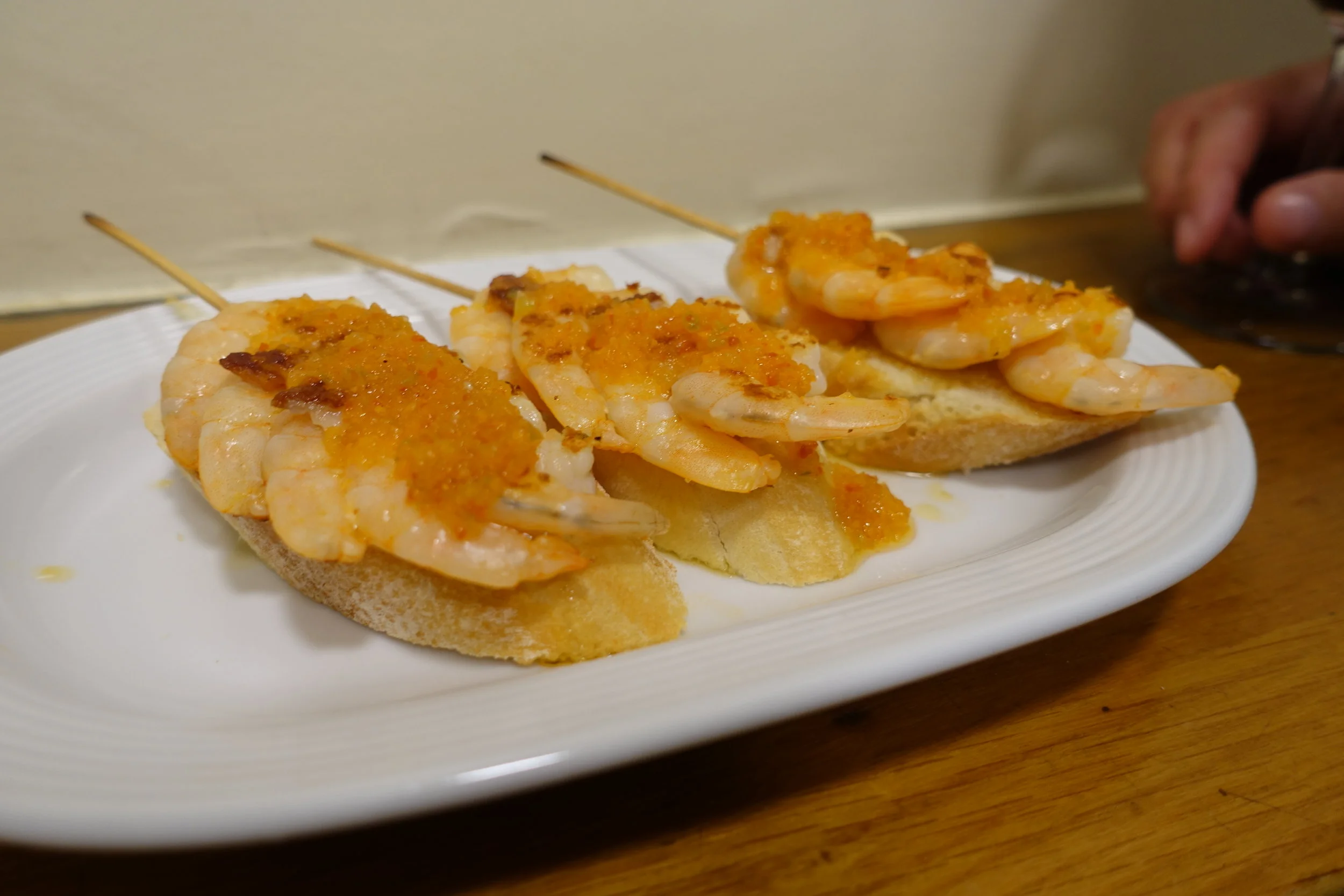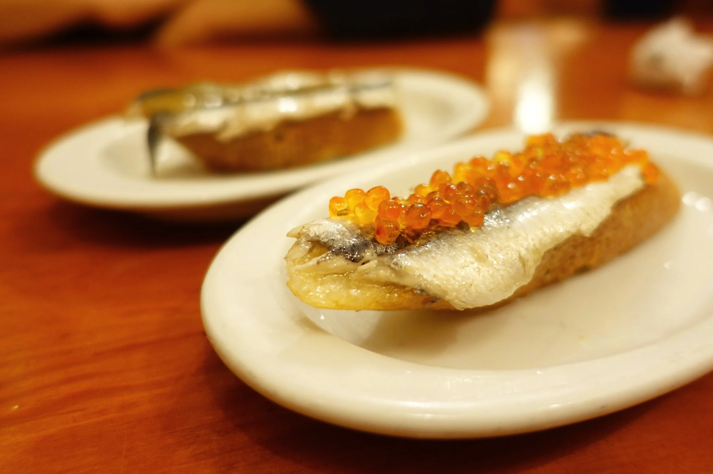 Buuuut they were so good that we had to get another couple. We already failed the one pintxos, one drink rule but that's okay, they were worth it. The one in front was trout roe on top of an anchovy and the other one was anchovy with foie gras. So good.