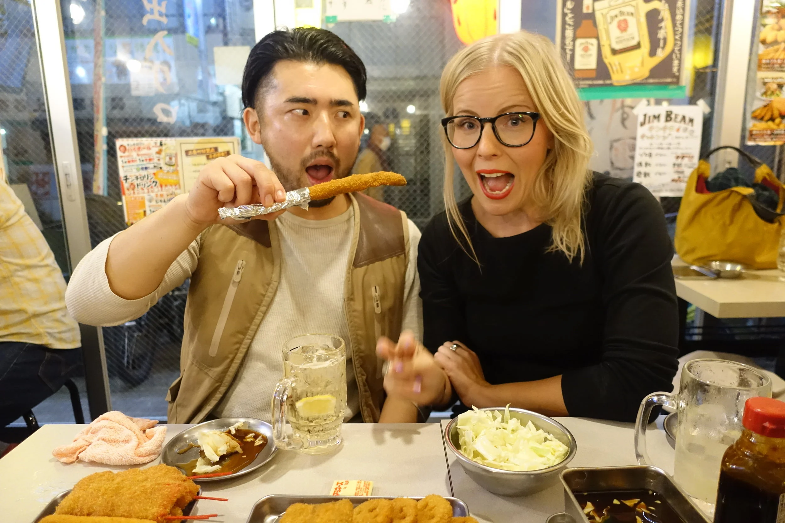 This kushikatsu restaurant is a whole lot of fun and super cheap. And when you order a highball they give you some die to throw and if you get a particular number you get your highball for free or half price. The place is called Kushikatsu Tanaka and it's a whole bunch of fun.