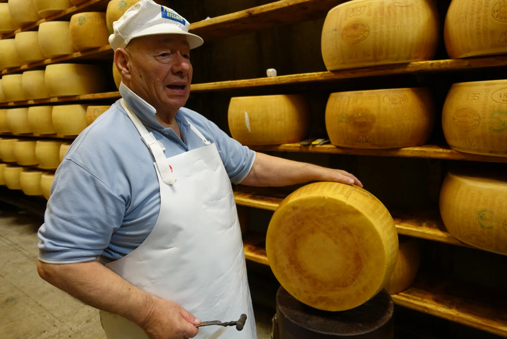 Giorgio showing us how they check to see if the cheese passes the quality test. You bang it with a small hammer and listen to the sound. It's some guy's job to go around to the cheesemakers and tap cheese all day.