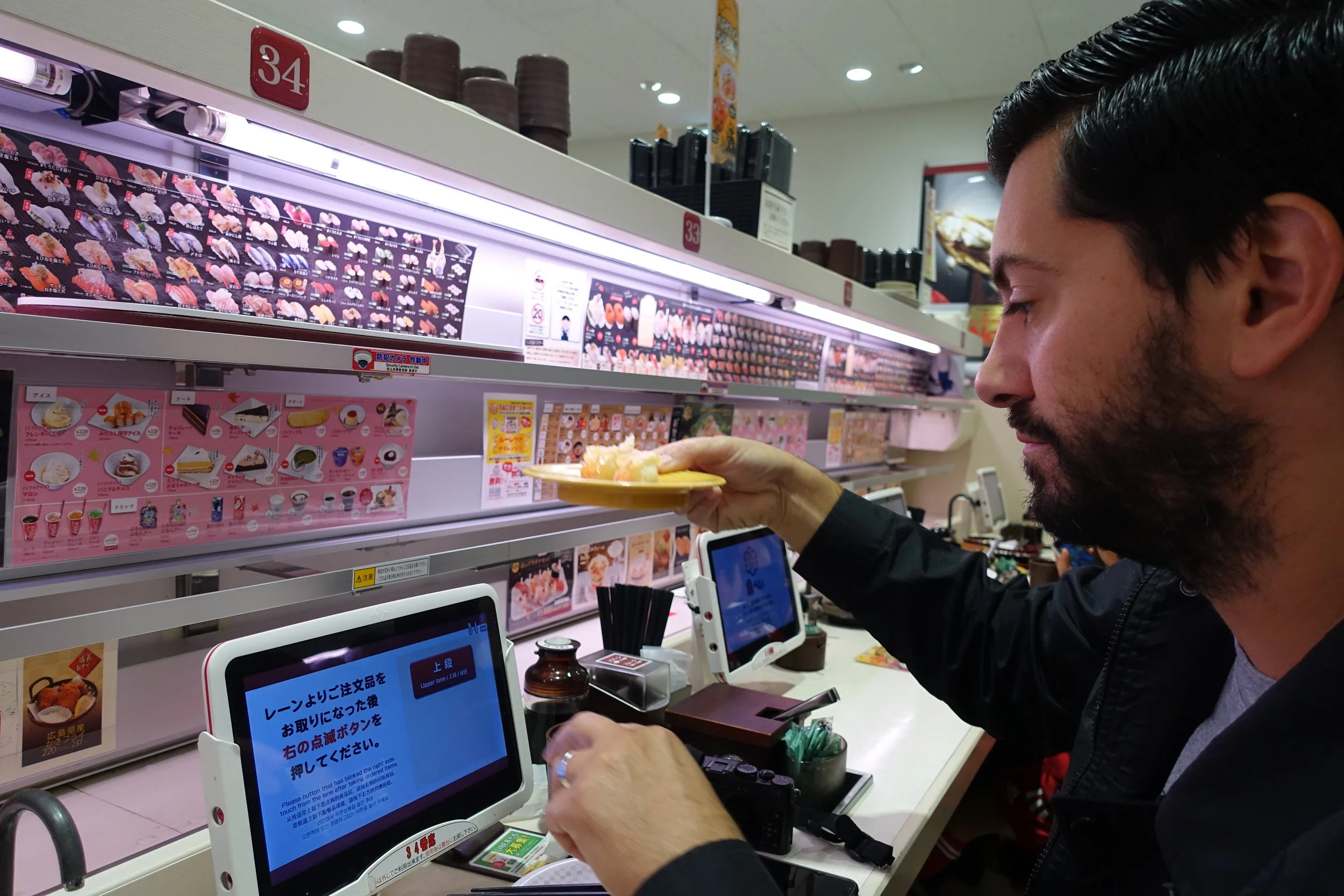 The thing that's different about Uobei is that you order off a touch screen (there is English available) and your sushi comes speeding out toward you on one of three conveyer belts. Once to take it off the belt, you press a button and the tray flies back to the kitchen from which it came. No muss, no fuss.