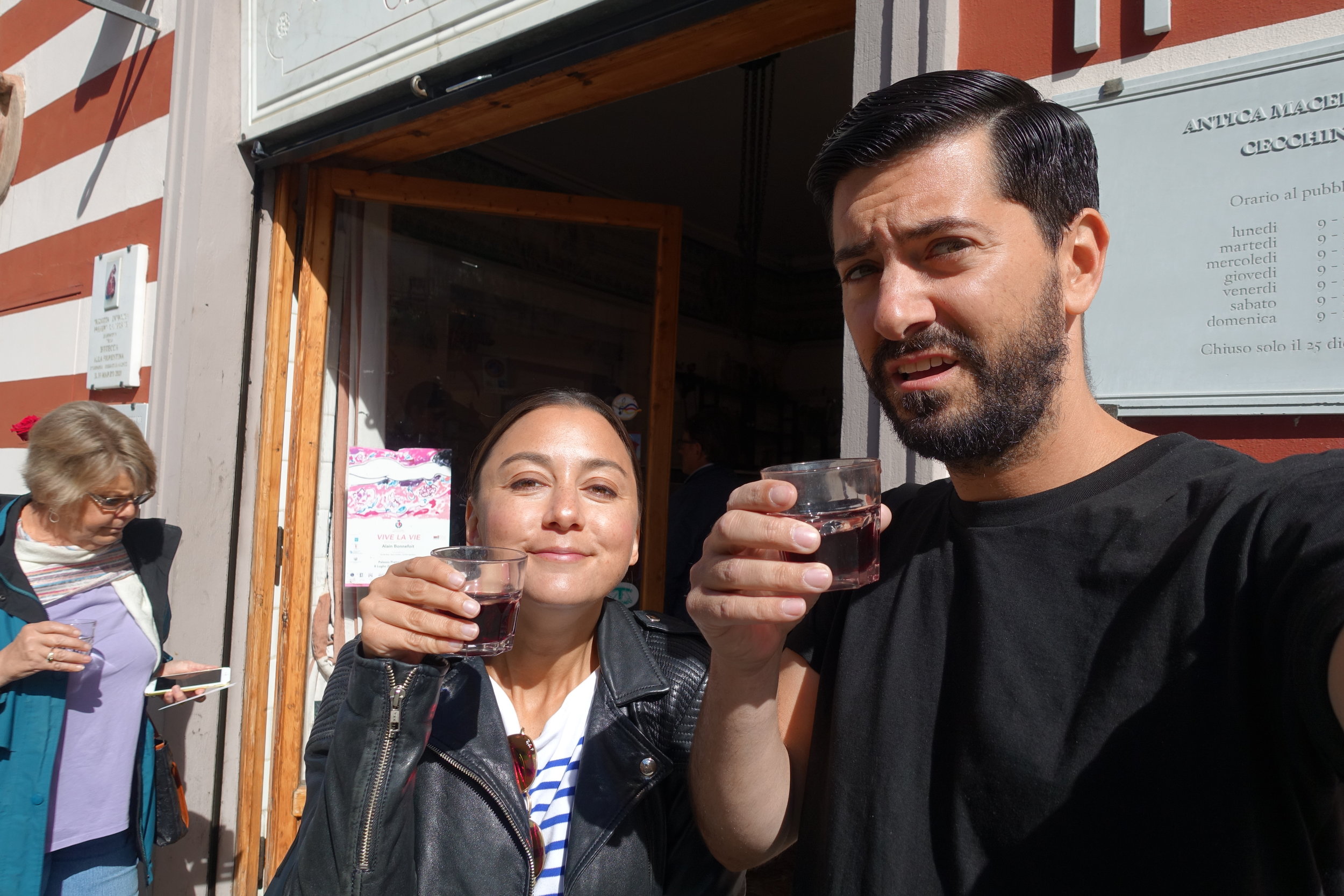 Not my finest photo, but here we are enjoying FREE WINE in front of the butcher. This is my kind of butcher.